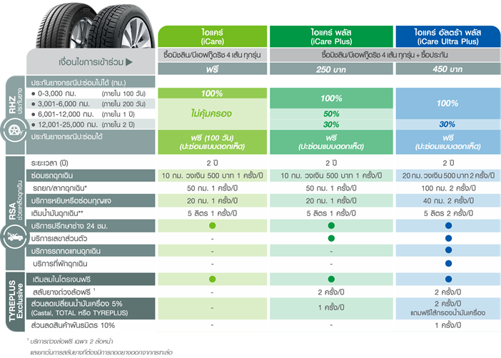 - ไอแคร์ อัลตร้า พลัส (iCare Ultra Plus) : เมื่อเปลี่ยนยางมิชลิน หรือ บีเอฟกู๊ดริช รุ่นใดก็ได้ 4 เส้น และซื้อแพคเกจประกันยางเพิ่ม มูลค่า 450 บาท ณ วันที่เปลี่ยนยางใหม่ พร้อมแอดไลน์ @tyreplus และลงทะเบียน